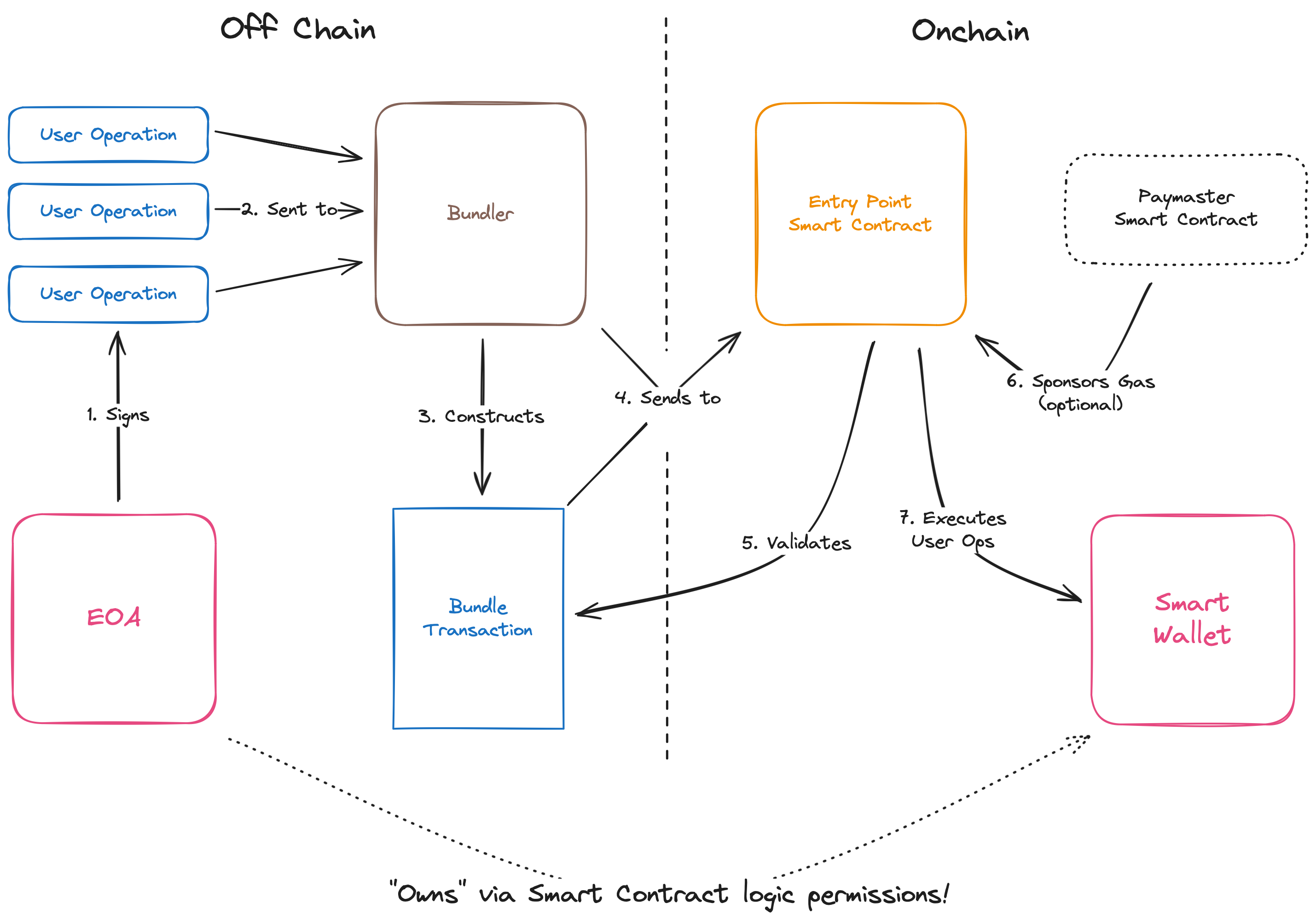 - The EOA account that owns the Smart Wallet – or mere has sufficient access to – signs a User Operation that should be executed by the Smart Wallet.
